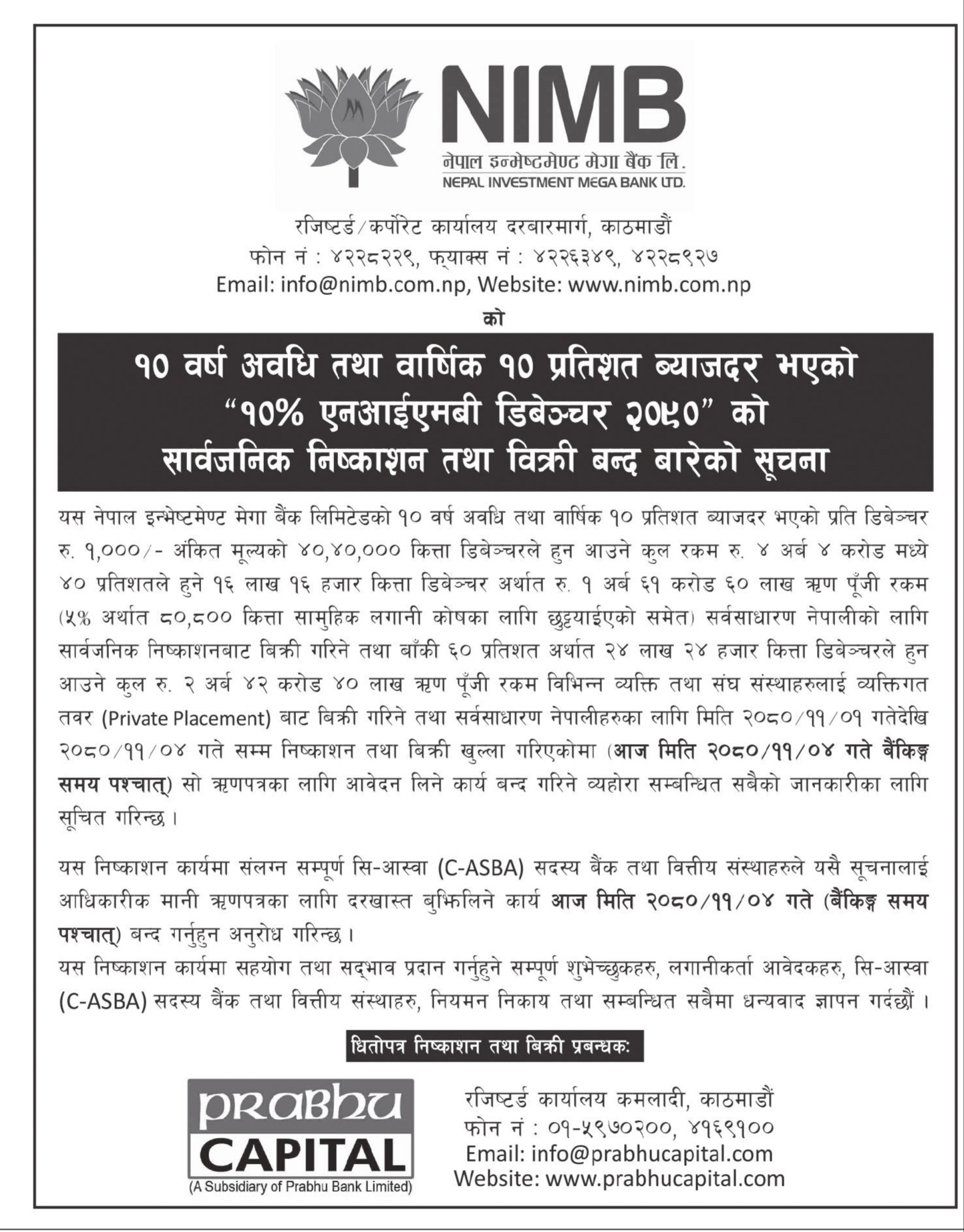 बिक्री प्रबन्धकको काम प्रभु क्यापिटलले गरेको छ । यसमा न्यूनतम २५ इकाईदेखि अधिकतम १० लाख इकाईसम्म आवेदन दिन सकिनेछ । यस ऋणपत्रमा सी–आस्वा सदस्य बैंक तथा वित्तीय संस्था र मेरो सेयर सफ्टवेयरमार्फत अनलाइनबाट आवेदन दिन सकिनेछ ।