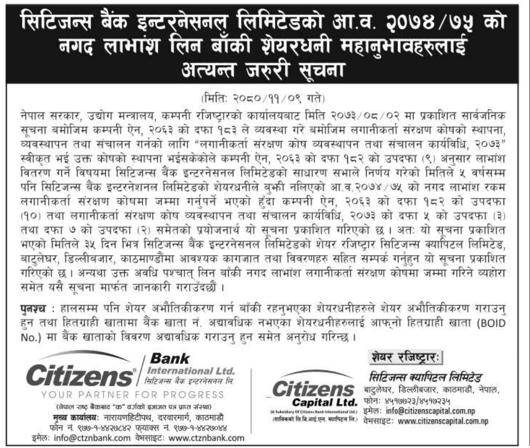 सिटिजन्स बैंकले आफ्ना सेयरधनीलाई ५ वर्ष पूरानो नगद लाभांश लिन आग्रह
