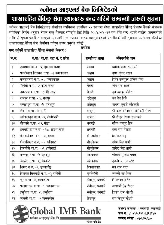 बैंकले २२ वटा स्थानमा रहेका शाखारहित बैंकिङ्ग सेवाहरु सञ्चालक समितिको निर्णय अनुसार नेपाल राष्ट्र बैंकबाट स्वीकृति लिएर साउन १७ गतेदेखि बन्द गरेको जनाइएको हो ।