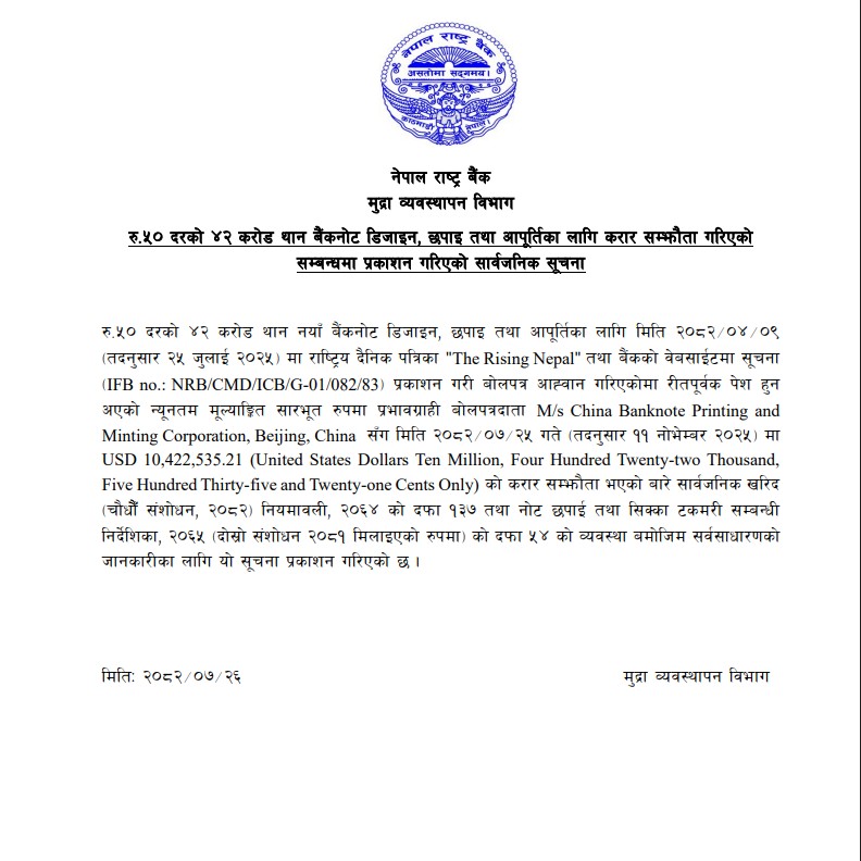 राष्ट्र बैंकले ४२ करोड थान नयाँ नोट डिजाइन, छपाइ तथा आपूर्तिका लागि बेइजिङको ‘चाइना बैंकनोट प्रिन्टिङ एन्ड मिन्टिङ कर्पोरेसन’सँग सम्झौता गरेको हो ।