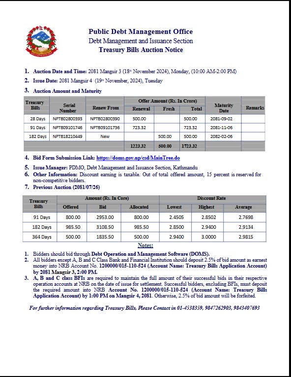 सार्वजनिक ऋण व्यवस्थापन कार्यालयले १८२ दिनको लागि ५ अर्ब रुपैयाँको ट्रेजरी नयाँ जारी गर्न लागेको हो । यो ट्रेजरी २०८२ जेठ ६ गते परिपक्व हुनेछ । यस्तै, २८ दिन र १८२ दिनको ट्रेजरी बिल नवीकरण गर्न लागेको हो ।