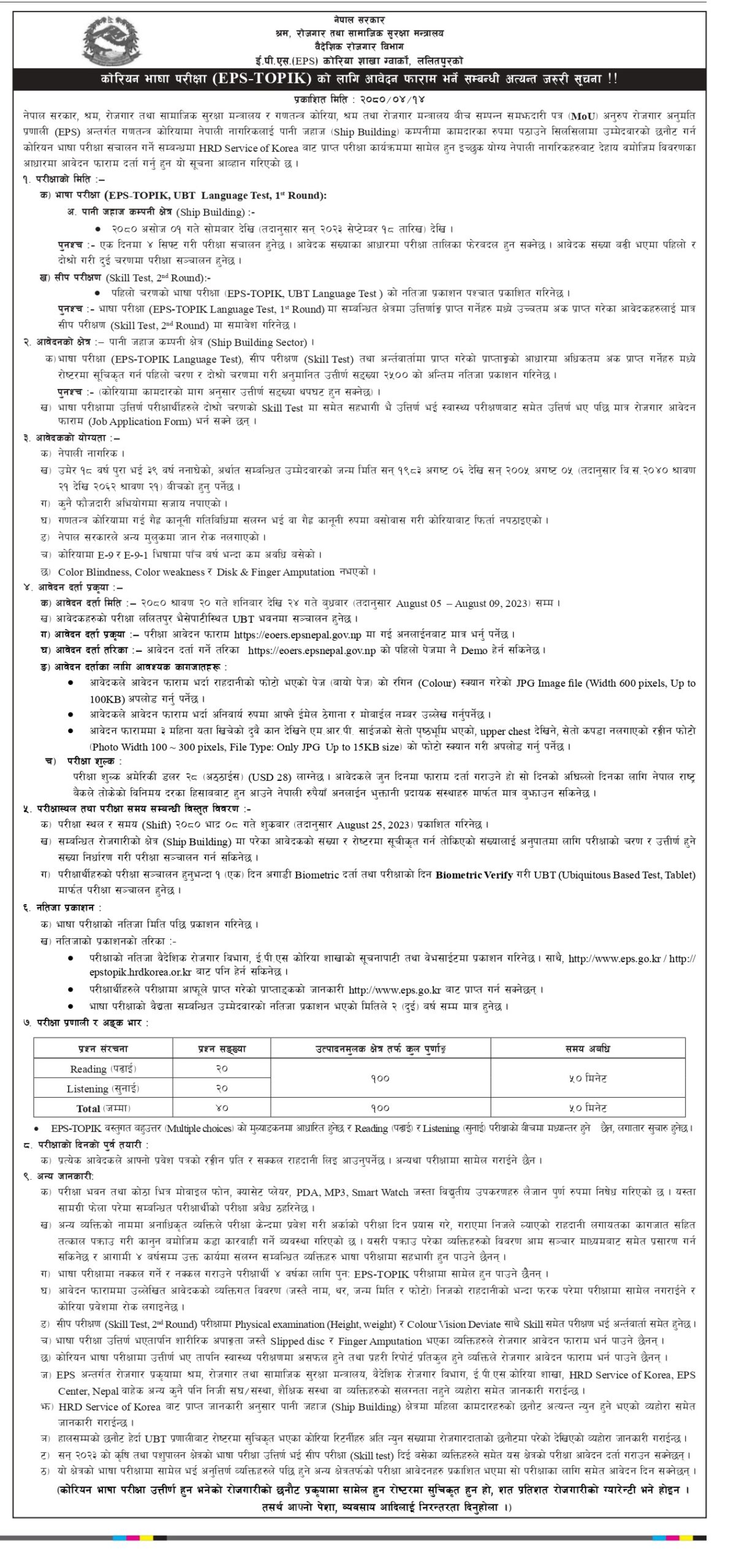 ‘नेपाल सरकार, श्रम, रोजगार तथा सामाजिक सुरक्षा मन्त्रालय र गणतन्त्र कोरिया, श्रम तथा रोजगार मन्त्रालयबीच सम्पन्न समझदारी पत्रअनुरूप रोजगार अनुमति प्रणाली अन्तर्गत् गणतन्त्र कोरियामा नेपाली नागरिकलाई पानी जहाज कम्पनीमा कामदारका रूपमा पठाउने सिलसिलामा उम्मेदवारको छनौट गर्न कोरियन भाषा परीक्षा संचालन गर्ने आवेदन फाराम दर्ता गर्नुहुन सूचना आह्वान गरिएको छ,’ इपिएस कोरिया शाखाको सूचनामा भनिएको छ।
