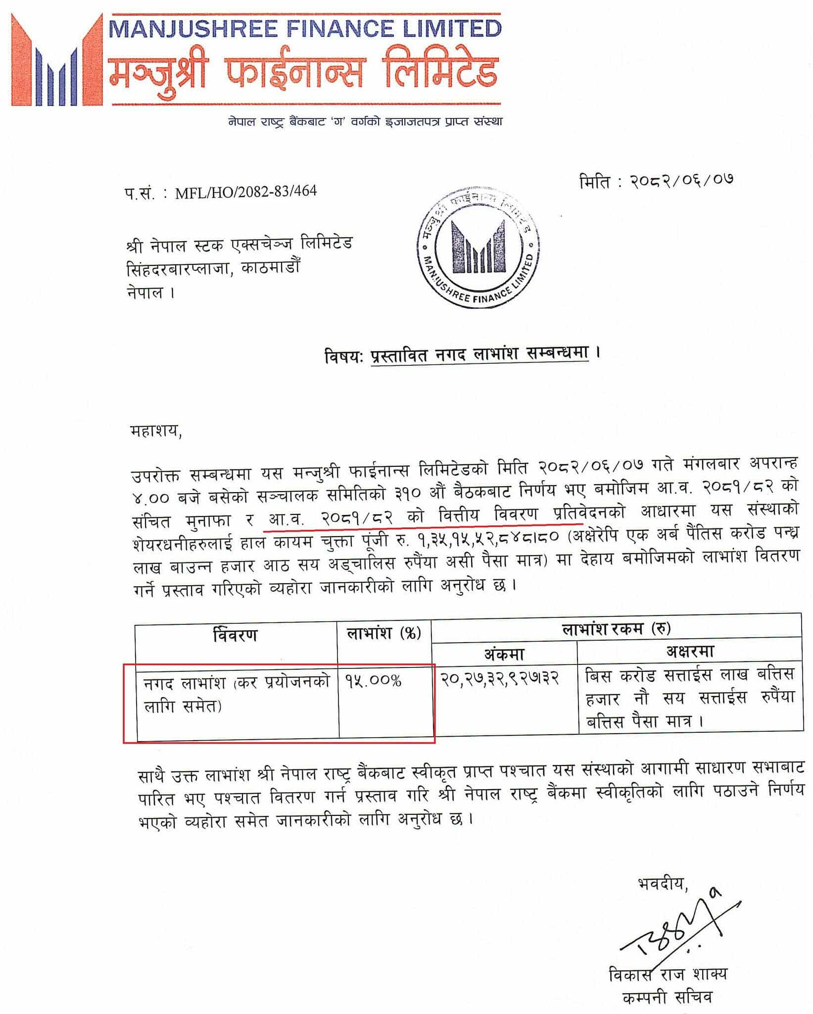 कम्पनीको सो प्रस्तावित लाभांश नेपाल राष्ट्र बैंकबाट स्वीकृत प्राप्त भएपछि कम्पनीको आगामी वार्षिक साधारण सभाले पारित गरेपछि वितरण हुनेछ ।