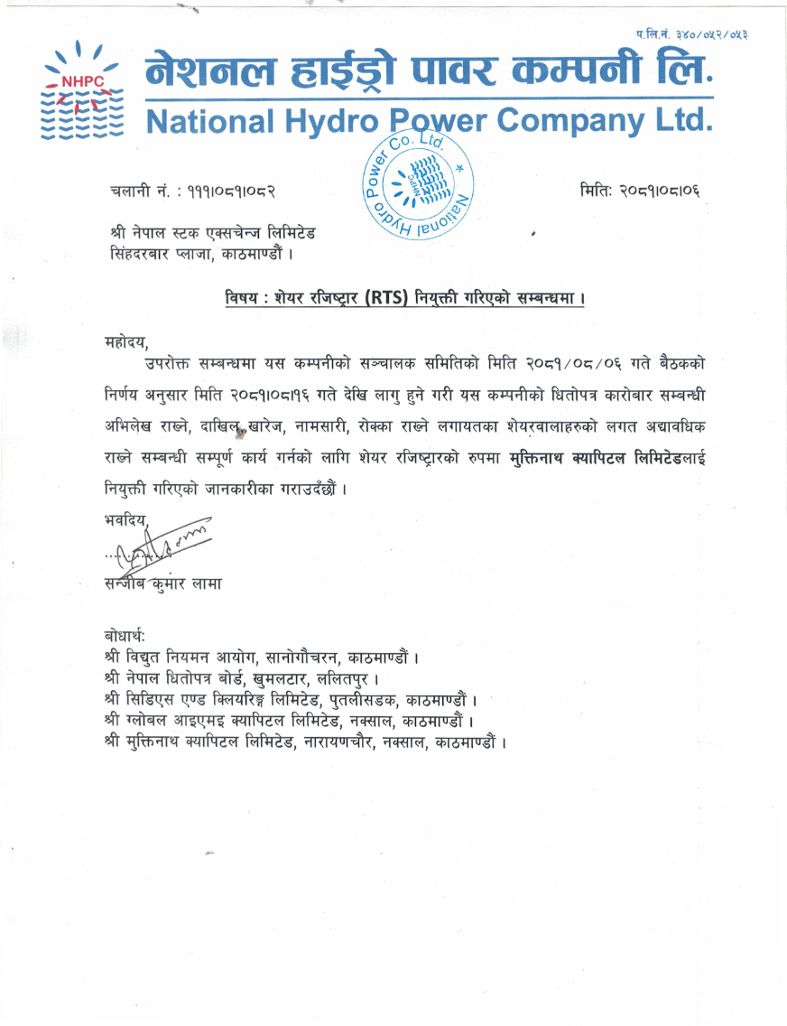 काठमाडौं । नेशनल हाइड्रोपावर कम्पनी लिमिटेडको शेयर रजिष्ट्रारमा मुक्तिनाथ क्यापिटल लिमिटेड नियुक्त भएको छ ।