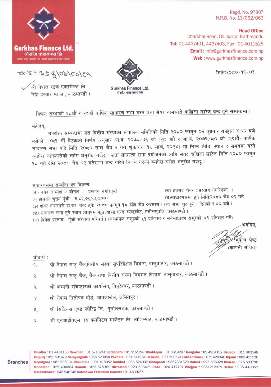 काठमाडौं । गोर्खाज फाइनान्सले २८औं र २९औं वार्षिक साधारण सभा गर्ने भएको छ। कम्पनीले २०७८/७९ र २०७९/८० को साधारणसभा चैत्र २ गते गर्ने जनाएको छ । कम्पनीको फागुन २ गते बसेको संचालक समितिको बैठकले उक्त मिति तय गरेको हो । कम्पनीले लाभांश प्रस्ताव गरेको छैन ।