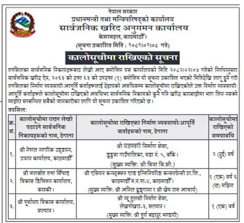 सार्वजनिक खरिद ऐन २०६३ को उपदफा (१) बमोजिम सूचना प्रकाशित भएको मितिदेखि लागु हुने गरी बाँकेको डडुवा गाउँपालिका–५ मा रहेको यज्ञेश्वर निर्माण सेवा र त्यसका प्रमुख व्यक्ति बिना बिसीलाई २ वर्षका लागि कालोसूचीमा राखिएको छ।
