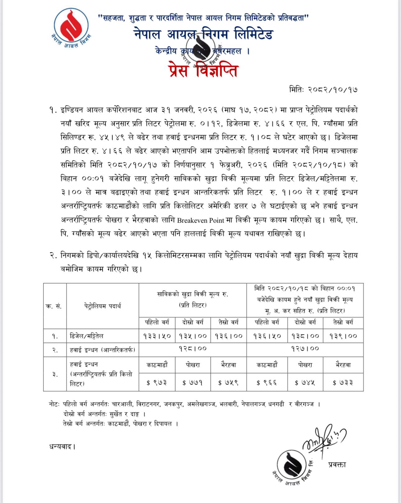 “इन्डियन आयल कर्पोरेसनबाट आज ३१ जनवरी, २०२६ माघ १७, २०८२ मा प्राप्त पेट्रोलियम पदार्थको नयाँ खरिद मूल्यअनुसार प्रतिलिटर पेट्रोलमा रु ०.१२, डिजेलमा रु ४.६६ र एलपी ग्यासमा सिलिन्डर रु ४५.४९ ले बढेर तथा हवाई इन्धनमा प्रतिलिटर रु १०८ ले घटेर आएको छ,” निगमले जारी गरेको विज्ञप्तिमा उल्लेख छ ।