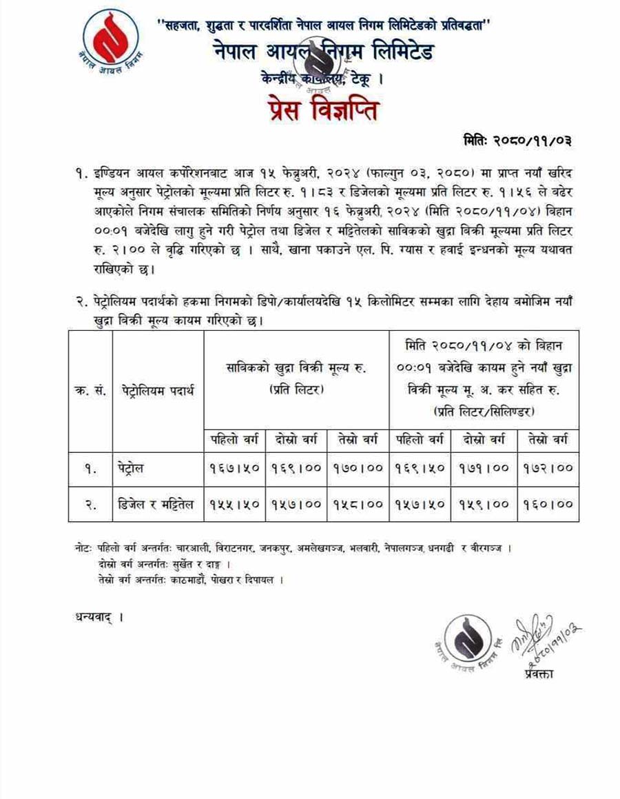 निगमका प्रवक्ता मनोज ठाकुरले बिहीबार साँझ जारी गरेको विज्ञप्तिअनुसार नयाँ मूल्य आज मध्यरातिदेखि लागू हुनेछ । खाना पकाउने एलपी ग्यास र हवाई इन्धनको मूल्य भने यथावत राखिएको विज्ञप्तिमा उल्लेख छ ।