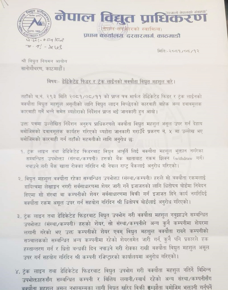 प्राधिकरणले राष्ट्र बैंकलाई पत्र लेखेर बक्यौता नतिरेका उद्योगहरूको बैंक खाता रोक्का गर्न पत्र पठाएको छ ।