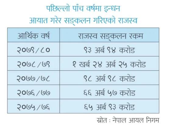निगमले आर्थिक वर्ष २०७५/७६ देखि आर्थिक वर्ष २०८९/८० सम्म भारतबाट झन्डै डेढ करोड किलोलिटर पेट्रोलियम पदार्थ (डिजेल, पेट्रोल, मटितेल, हवाई इन्धन र एलपी ग्यास) आयात गरेर चार खर्ब ४९ अर्ब तीन करोड रुपियाँ राजस्व सङ्कलन गरेको हो ।