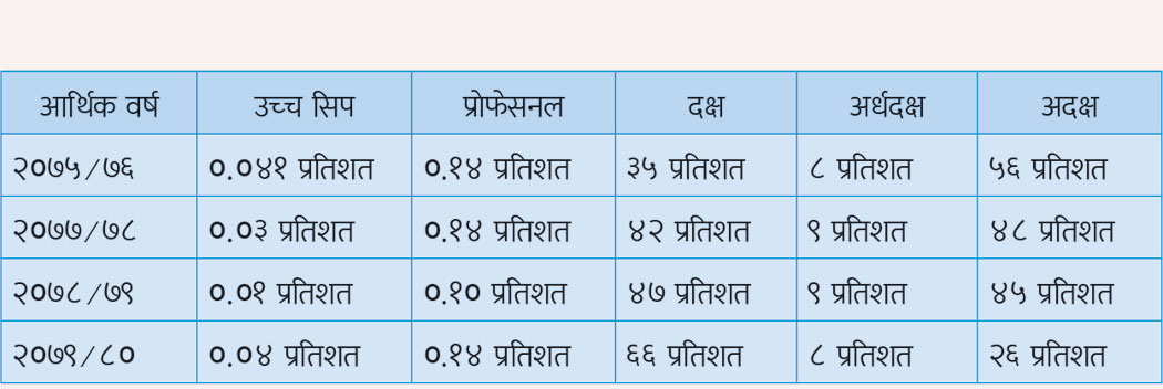 विभागका अनुसार आव २०७९/८० मा सात लाख ७१ हजार ३२७ जनाले श्रम स्वीकृति लिएर विदेश गएकामध्ये अर्धदक्ष भएर जानेको सङ्ख्या ६० हजार ५५५ जना (आठ प्रतिशत) रहेको छ भने अदक्षको सङ्ख्या दुई लाख दुई हजार ६१६ जना (२६ प्रतिशत) रहेको छ । यस्तै सो अवधिमा उच्च सिपयुक्त ( इन्जिनियर, चिकित्सक, व्यवस्थापक) मा काम गर्न जानेको सङ्ख्या एक हजार ४१० जना (दुई प्रतिशत) रहेको छ ।