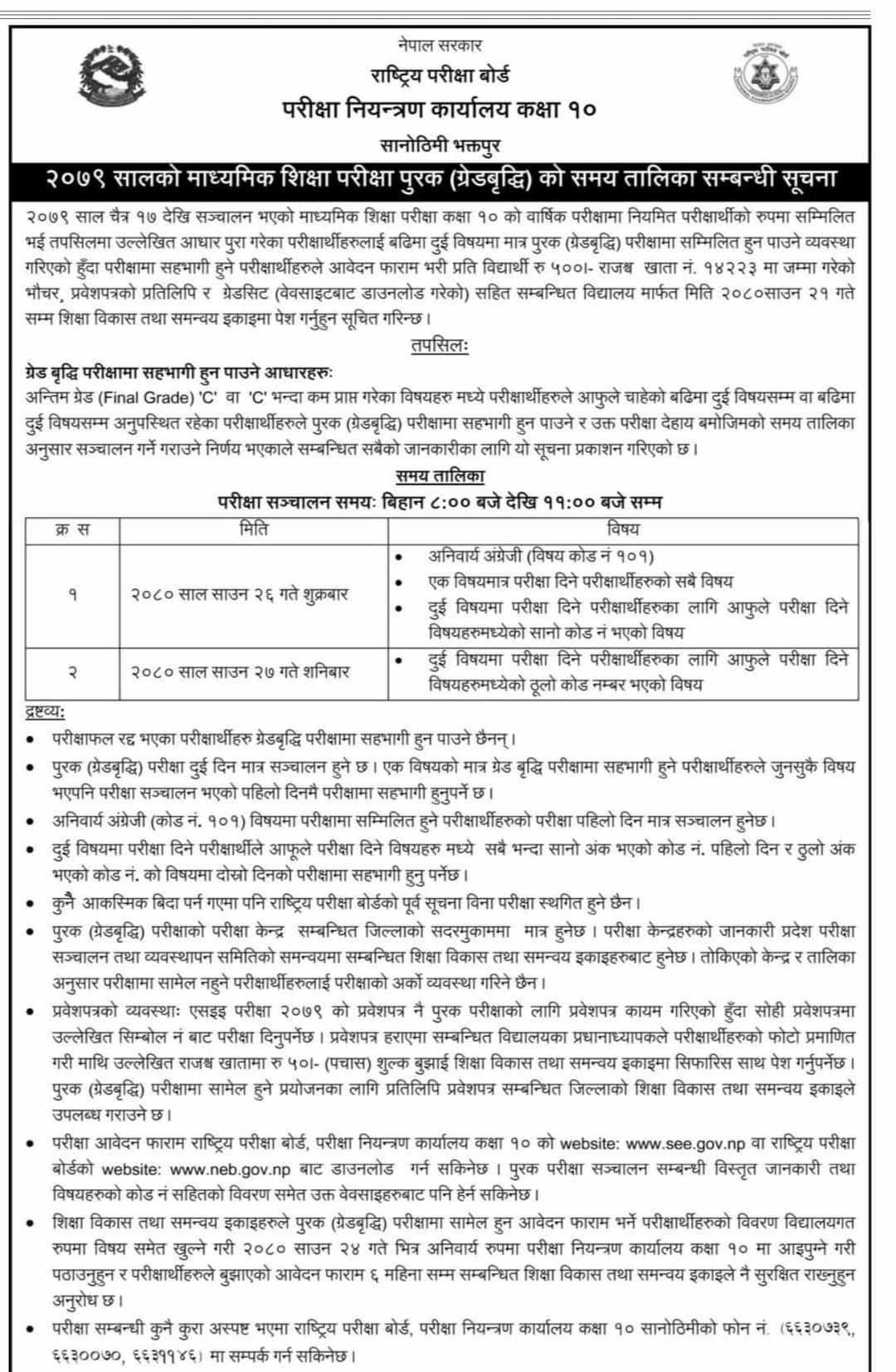 परीक्षा रद्द भएका परीक्षार्थीले पूरक परीक्षा दिन पाउने छैनन्। एक विषयको मात्र पूरक परीक्षा दिनुपर्ने विद्यार्थीले पहिलो दिन परीक्षा दिनुपर्नेछ।